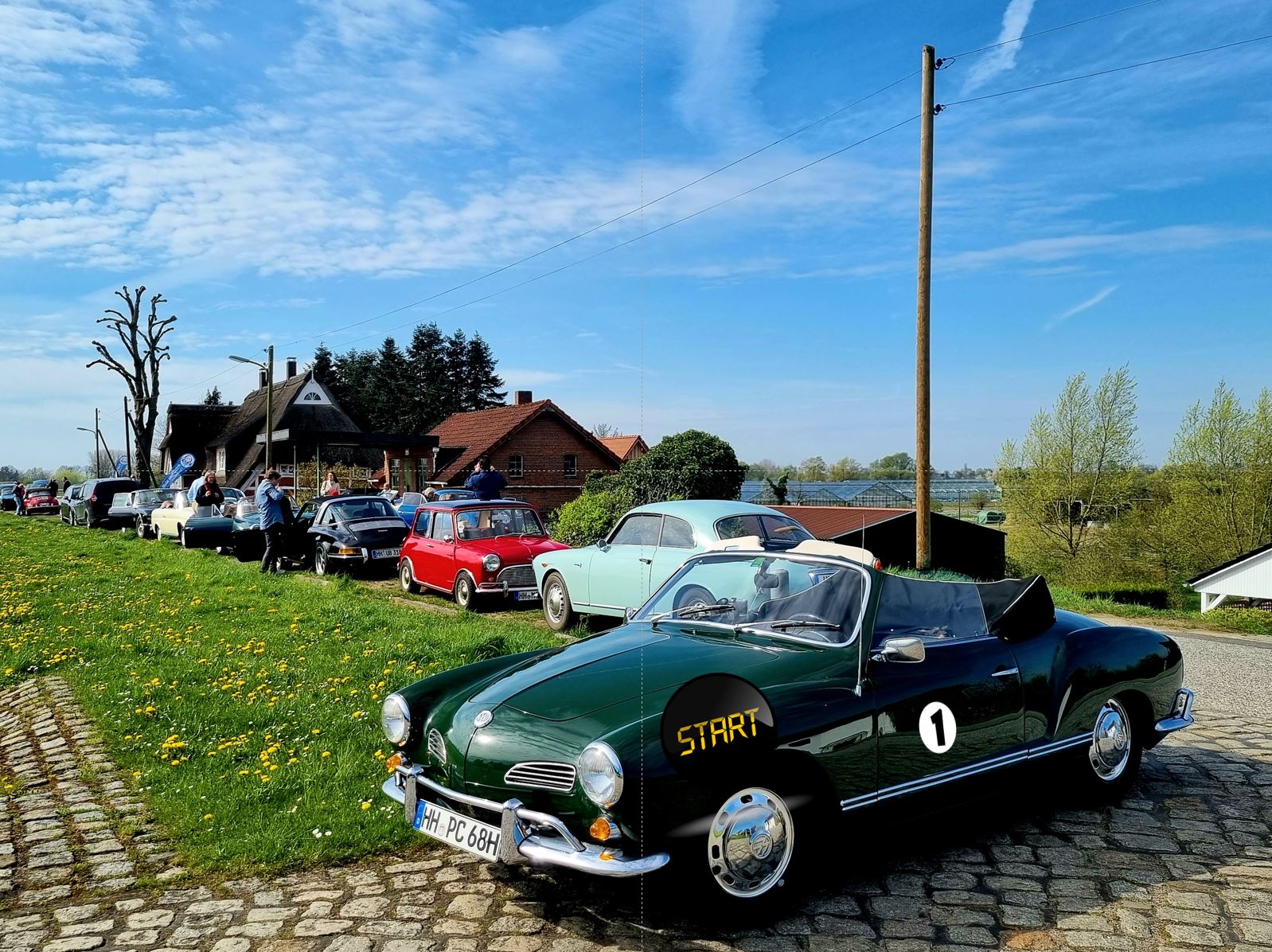 Die äußeren Bedingungen waren für so ein Vorhaben nahezu optimal. Die Scheiben beschlugen von innen. Der anhaltende Sprühregen changierte von leichter, kaum wahrnehmbarer Luftfeuchtigkeit, über durchdringende, fein zerstäubte Tropfen bis hin zu…ach lassen wir das. Die Pferdesportaffinen kennen diese Umstände als tiefes Geläuf. Dies hat die fast vierzig Teilnehmerinnen und Teilnehmer aber nicht weiter beeindruckt. Dafür hatten wir die Nebenstrecken vom Stufenwald im südlichen Hamburger Umland, Geestrand, Teilen der Nordheide und moorigen Niederungen fast für uns alleine. Nicht, dass der Begriff shared space uns unbekannt wäre, doch auf engen Spurbahnen kann der Gegenverkehr herausfordernd werden. Nach der zweiten Zeitprüfung, am Ende der gut 150 km hatte Petrus ein Einsehen, oder ihm war einfach der Nachschub an weiterem Niederschlag ausgegangen. Lieferengpass heißt dies im aktuellen Sprachgebrauch des Tagesgeschäfts. Lachende Teams am Ziel, geschaffte Besatzungen, fröhliche „yes, we did it“ –Gesichter…und schon Blankoanmeldungen für die nächste Ausgabe. Schauen wir mal, oder Ihr werdet es schon sehen. Epilog: Die Betreiber des Bioland Bauerhof am Zielort erfreuten sich sehr über unsere Fahrzeuge, den Umstand der ausgeteilten Ölpappen und hatten keine ideologischen Berührungsängste. Kurzer Kommentar zu den Autos: Nachhaltiger geht es kaum. SB Manuel Cohrs
